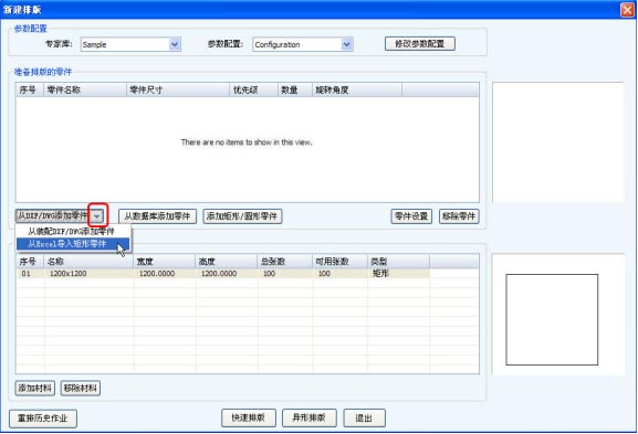 (图五) 在“新建排版”窗口,点“从DXF/DWG添加零件”按钮右则下拉三角中的“从EXCEL导入矩形零件”,如图六:
